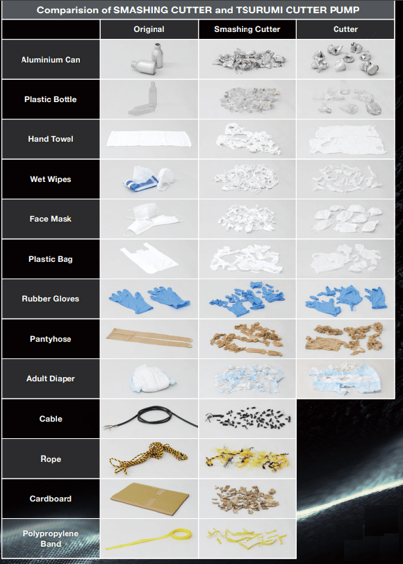 Dưới đây là những vật liệu mà bơm cánh nghiền Tsurumi 100BN42.2 có thể nghiền nhỏ